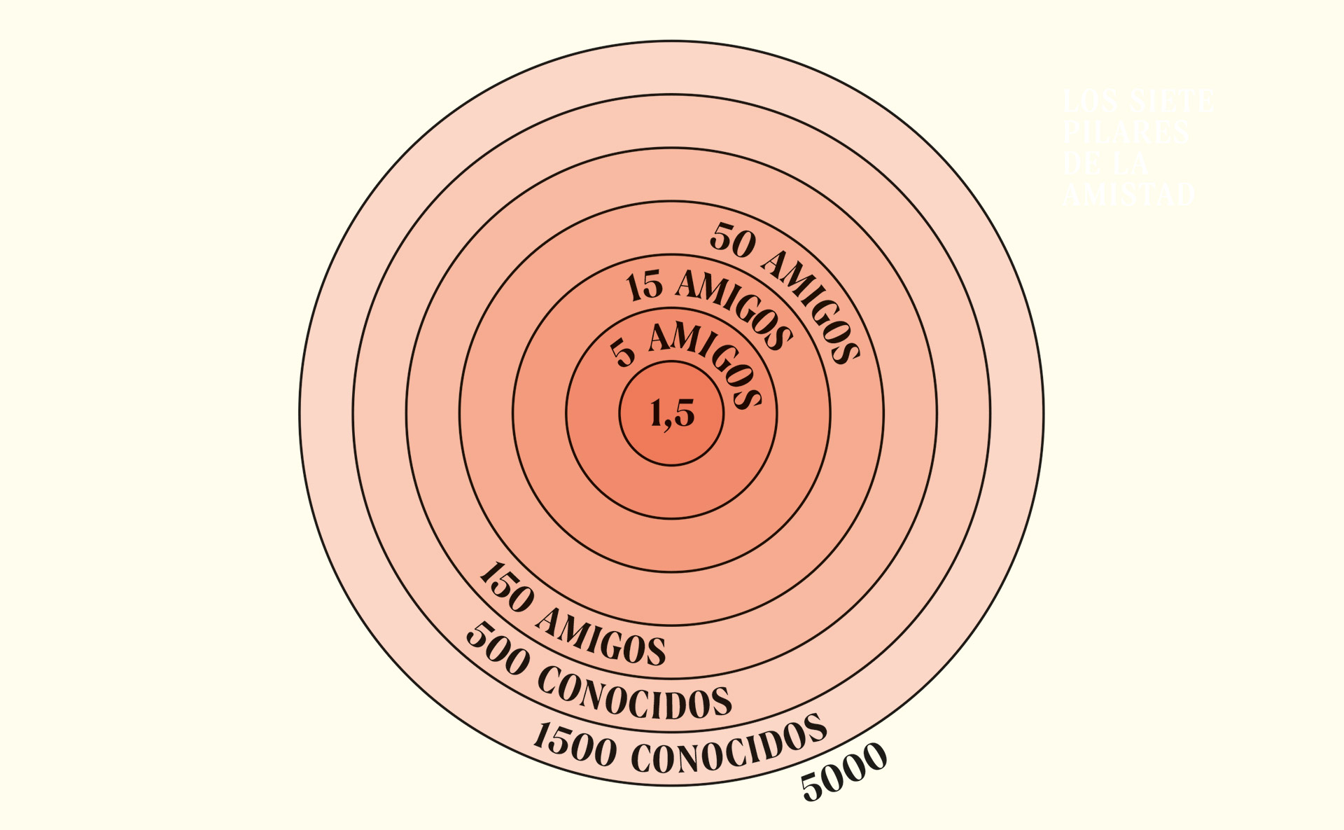 El equipo de Dunbar preguntó a los participantes de su estudio cómo conocieron a sus amigos, la última vez que los habían visto, cómo de emocionalmente vinculados se sentían a ellos... El análisis de esos datos permitió al equipo crear las escalas numéricas necesarias para determinar los famosos círculos de Dunbar, ya que, en términos de amistad –cree el antropólogo– las relaciones se estructuran de forma concéntrica. Y cada capa triplica el tamaño de la que la precede: 5 amigos íntimos, 15 amigos cercanos, 50 buenos amigos, 150 amigos... A partir de 500, ya son solo conocidos.