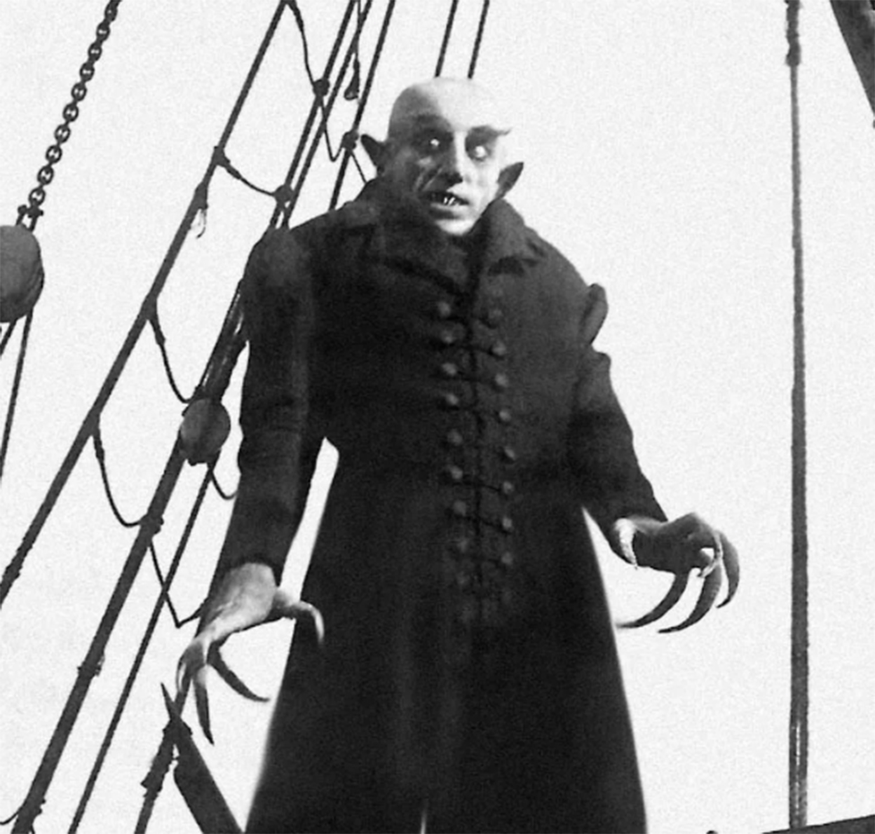 Además, Murnau utiliza recursos técnicos hasta entonces apenas explorados (imágenes aceleradas o ralentizadas, utilización de película negativa) que contribuyen a envolver la película en un hálito de irrealidad; y así, logra que los elementos terroríficos irrumpan de un modo a la vez vívido y nebuloso, como traídos por el viento que escalofría o los sueños que sobrecogen. De un modo a veces subliminal, Nosferatu nos propone una segunda lectura que nos aparta del asunto vampírico, para invitarnos a pensar en las fuerzas telúricas e invisibles que llevan y traen las enfermedades, a lomos del viento, sembrando muerte y desolación a su paso. Nosferatu es, de algún modo, encarnación de los arcanos que anidan en los entresijos de la naturaleza y que, una vez desatados, se multiplican como la copiosa noche; Nosferatu encarna, de algún modo, el miedo a las enfermedades sin cura, a los microbios que ni siquiera el microscopio detecta, a la sombra que se derrama sobre el mundo, marchitándolo, y que sólo la luz del sol –antiséptica y sanadora—puede exorcizar. Murnau no rehuye los pasajes más “carnales” de la historia de Stoker, ni trata de eludir la atracción magnética que Nosferatu (un Max Schreck icónico) ejerce sobre Ellen, la protagonista femenina (Greta Schroeder); pero incluso en estos momentos lo macabro evanescente se sobrepone a lo meramente físico, envolviendo la película en su particular aroma de crisantemo y pudridero.