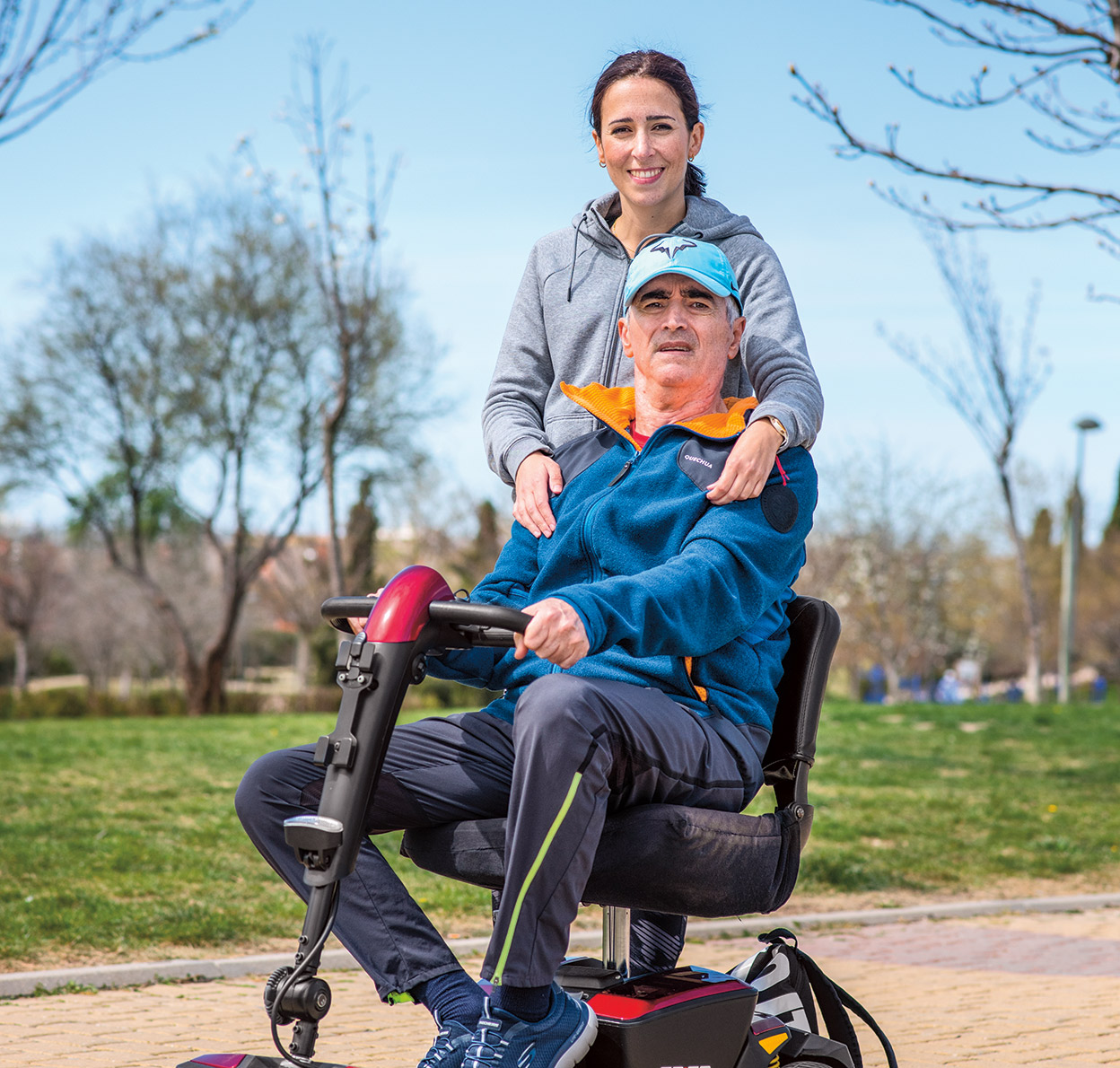 «Me diagnosticaron la enfermedad hace dieciséis años y es una modalidad que responde muy mal a las terapias y a los fármacos. Ahora estoy en fase cuatro y dependo de mi mujer y de mi hija para que me ayuden con todo. A veces tengo movimientos involuntarios muy pronunciados y voy en silla de ruedas. No puedo andar, pero sí correr. Y me hace muy feliz.