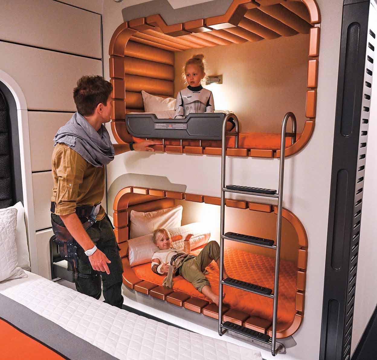 El hotel cuenta con más de cien cabinas de pasajeros a bordo y la oferta de Walt Disney World incluye la visita al parque temático de Star Wars y las comidas, y cuesta la friolera de 4304 euros dormir dos noches (lo que dura la inmersión) en una cabina doble. Si comparte la habitación con sus hijos, son más de 6000.