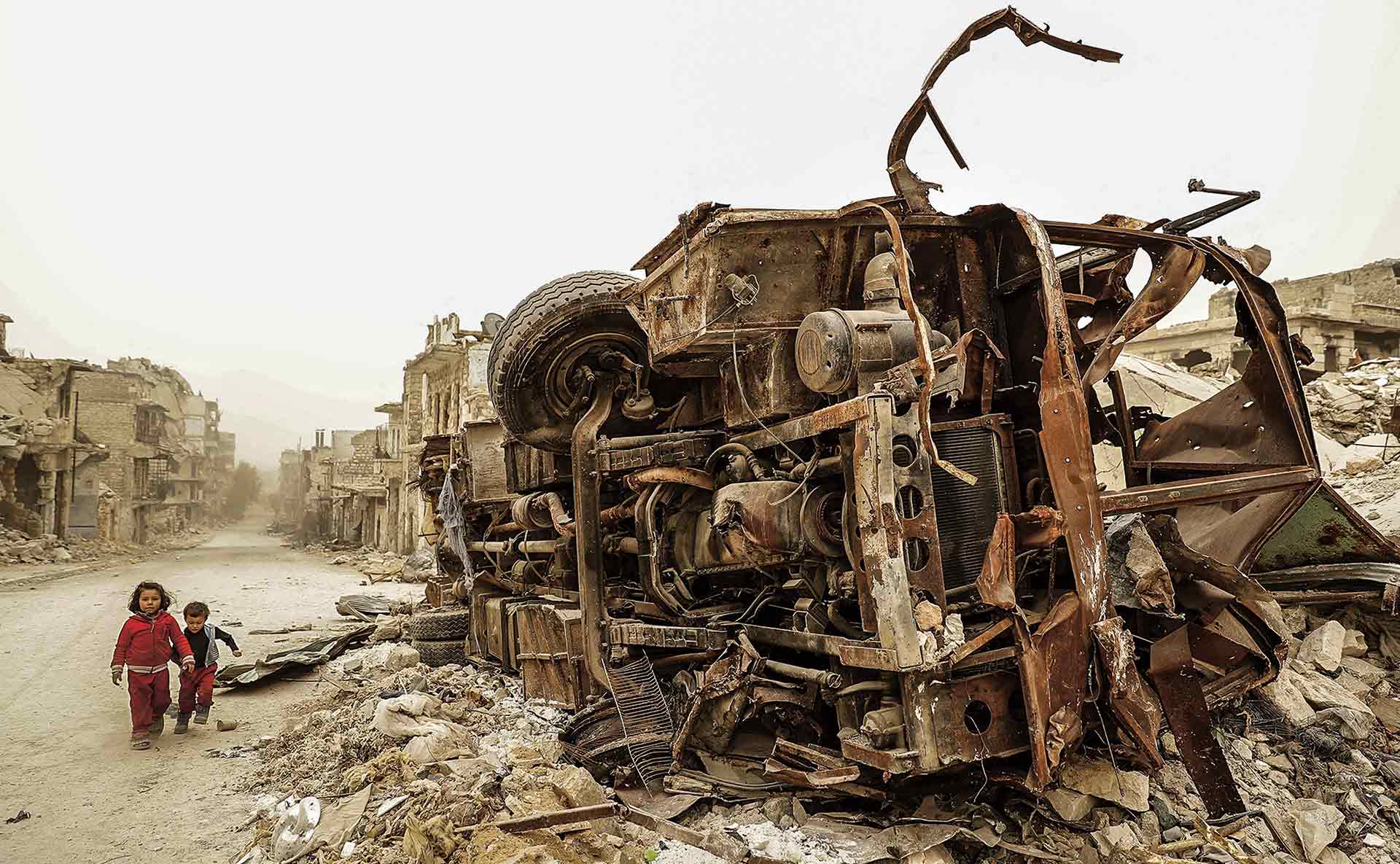 En Alepo tuvieron lugar los mayores enfrentamientos entre las tropas gubernamentales de Bashar Háfez al-Ássad y los rebeldes. Diez años de guerra, que costaron la vida a 500 mil personas en todo el país, han dejado la ciudad en ruinas. En la imagen superior, unos niños caminan en el barrio de Karm al-Jabal, en medio de una tormenta de arena.