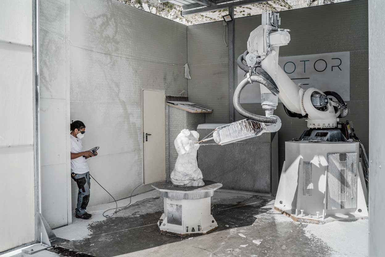 El mármol es el mismo que utilizaron Miguel Ángel, Gian Lorenzo Bernini y otros grandes maestros de la Historia del arte, pero quien empuña los cinceles ahora es un brazo robótico. Extiende su muñeca giratoria y su dedo metálico recubierto de diamantes hacia una pieza reluciente de mármol de Carrara, el Rolls de los mármoles, y esculpe piezas nuevas o copias excelentes de obras clásicas. Este escultor del siglo XXI se llama ABB2 y es uno de los 'robots escultores' de la empresa Robotor que trabajan en Carrara y cuya participación en el arte está generando una ácida polémica en Italia.