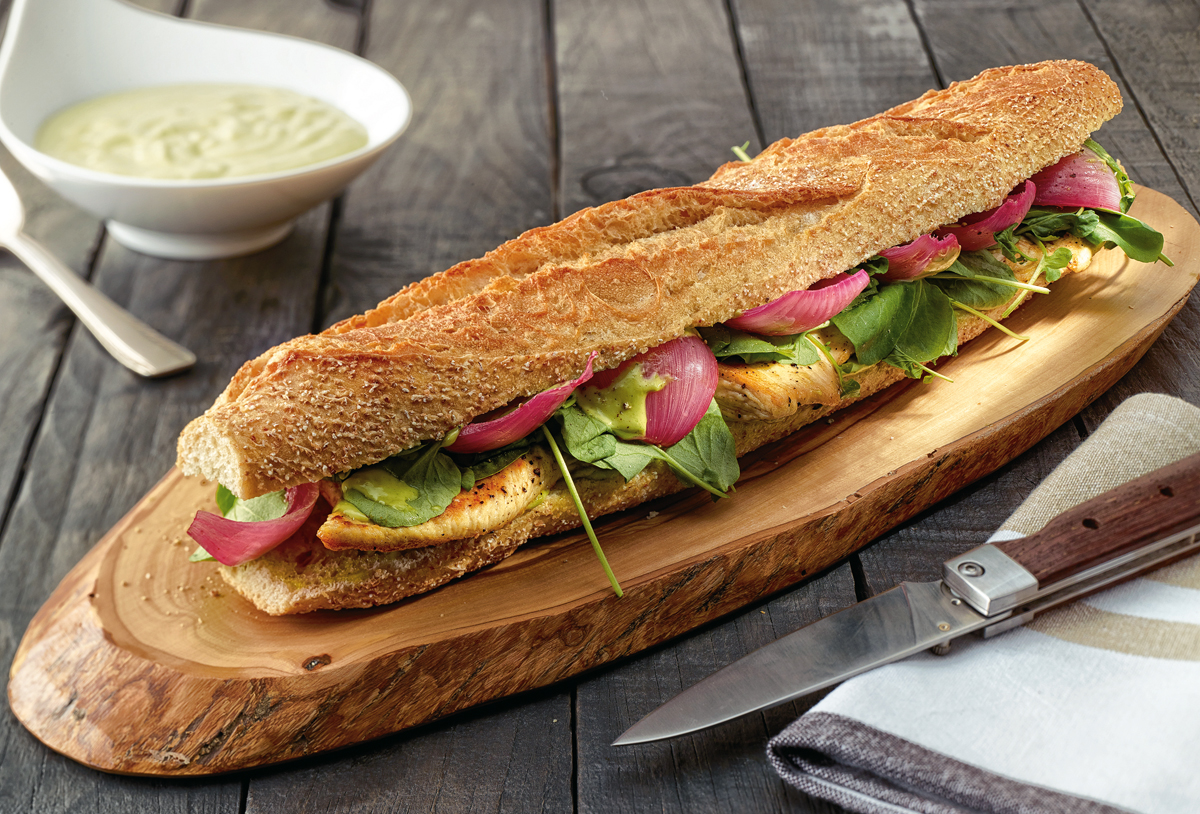 4. Se corta el pan por la mitad y se untan las partes interiores con la mayonesa de ostras. Se alinean los berros con unas gotas de aceite de oliva y sal, justo antes de montar el bocadillo, de este modo: pan, mayonesa de ostras, pechuga, pétalos de cebolla, berros, mayonesa de ostras y pan.