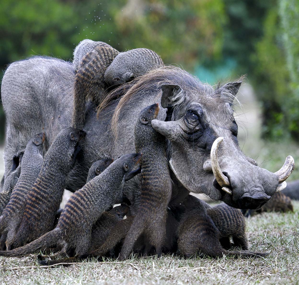 Estas mangostas no están atacando al enorme facocero de la sabana africana. Todo lo contrario, le están practicando una relajante limpieza de cutis. Mucho antes de que los salones de belleza se pusiesen de moda entre los humanos, en el reino animal ya se practicaba este tipo de servicios entre distintas especies.