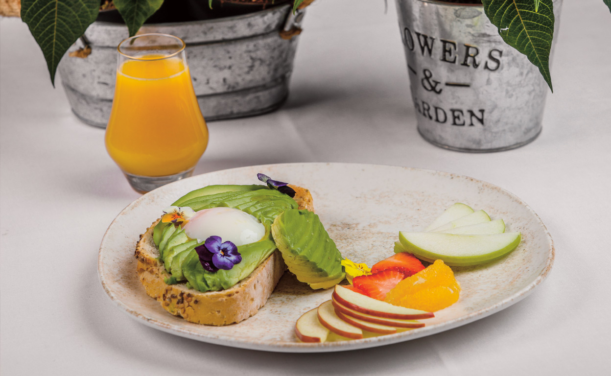 «Una rebanada de pan de semillas con rodajas de aguacate y un huevo poché. Zumo de naranja, manzana verde y roja, fresas... y flores comestibles: me inspiran».