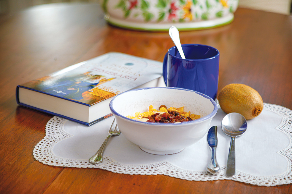 «Tomo un café con leche y un bol con leche y cereales (muesli), al que añado almendras y pasas… Aparte, además, un kiwi».