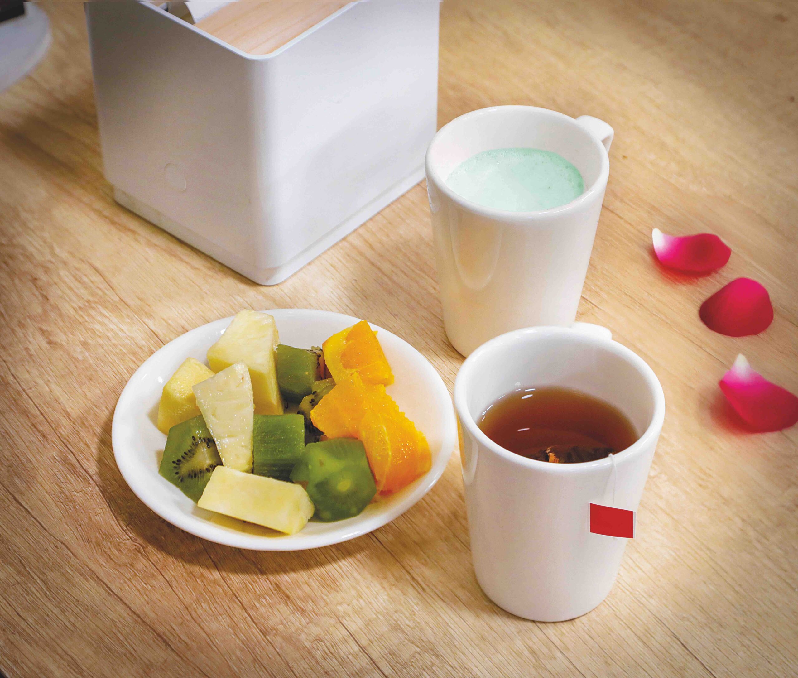 «Una infusión digestiva, de florecitas, tipo poleo, menta, hierbabuena, manzanilla… nunca té; fruta de temporada y leche de guisantes y copos de avena. Delicioso».