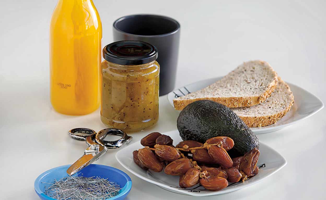 «... y mi propio pan integral. Tomo un descafeinado, zumo de naranja, dos tostadas (con mantequilla y mermelada, y con aceite y aguacate), fruta y dátiles».